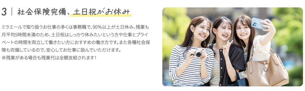 また、ミラエール自体が無期雇用(期間の定めのない契約)なので、法律上の3年ルール(同じ職場にいられるのは3年まで)の対象外です。そのため、派遣先が変わらず、ミラエールの社員のまま何年も働き続けることになる可能性も十分にあります。